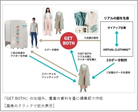 섬유 전문상사인 토요시마(TOYOSHIMA)는 가상세계의 아바타와 현실세계의 플레이어가 같은 옷을 구입해 함께 착용하는 것(GET BOTH, BOTH BUY)을 즐길 수 있도록 PocketRD*와 협업해 프로젝트를 진행하고 있다.
