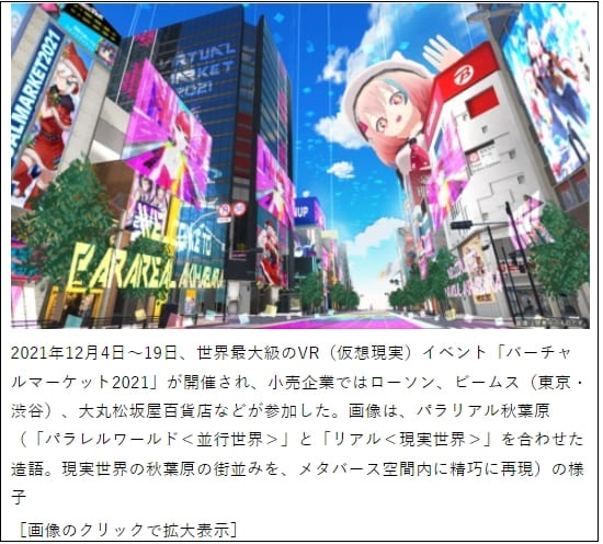 로손은 21년 12월 4~19일 개최된 '버추얼 마켓 2021*'에 처음으로 참가하여 현실 세계의 아키하바라의 거리와 로손의 가상 점포를 메타버스 공간 내에 정교하게 구현했다.