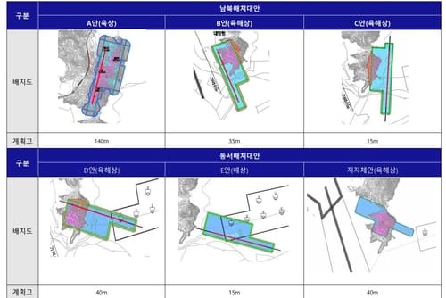 연구진은 당초 활주로 배치 방향과 지형 등을 고려해 ▲ A안(남북배치-육상) ▲ B안(남북배치-육해상) ▲ C안(남북배치-육해상·B안과 높이가 다름) ▲ D안(동서배치-육해상) ▲ E안(동서배치-해상) 등 총 5개 배치 대안 후보를 선정했다.