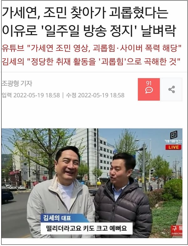 유튜브의 가세연 일주일 방송 정지에 이은 또 하나의 폭력