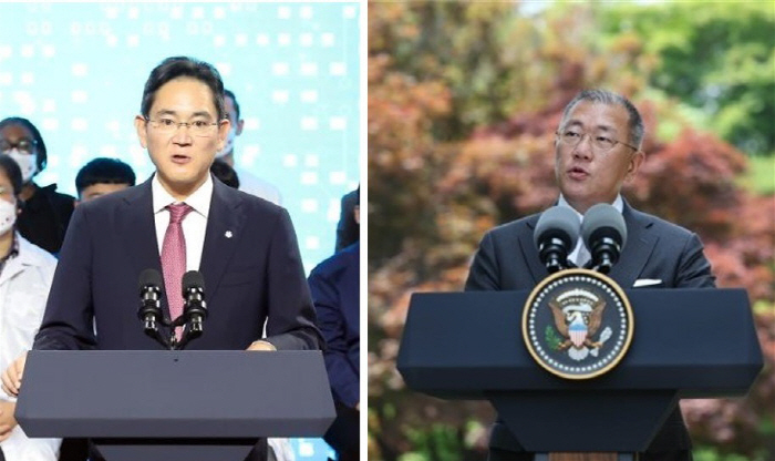22일 조 바이든 미국 대통령이 사흘간의 방한 일정을 마치고 출국한 가운데 '민간 외교관'으로 나선 이재용 삼성전자 부회장과 정의선 현대자동차그룹 회장의 유창한 영어 실력이 주목받고 있다.