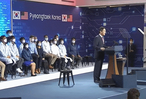 이날 환영사를 맡은 이 부회장은 행사 시작 전까지 마스크를 낀 채 옆자리에 앉은 지나 레이몬도 미국 상무장관과 담소를 나눴다. 이내 행사의 막이 오르자 이 부회장은 무대에 마련된 대형 화면 영상 속 직원의 소개로 단상에 올랐다.