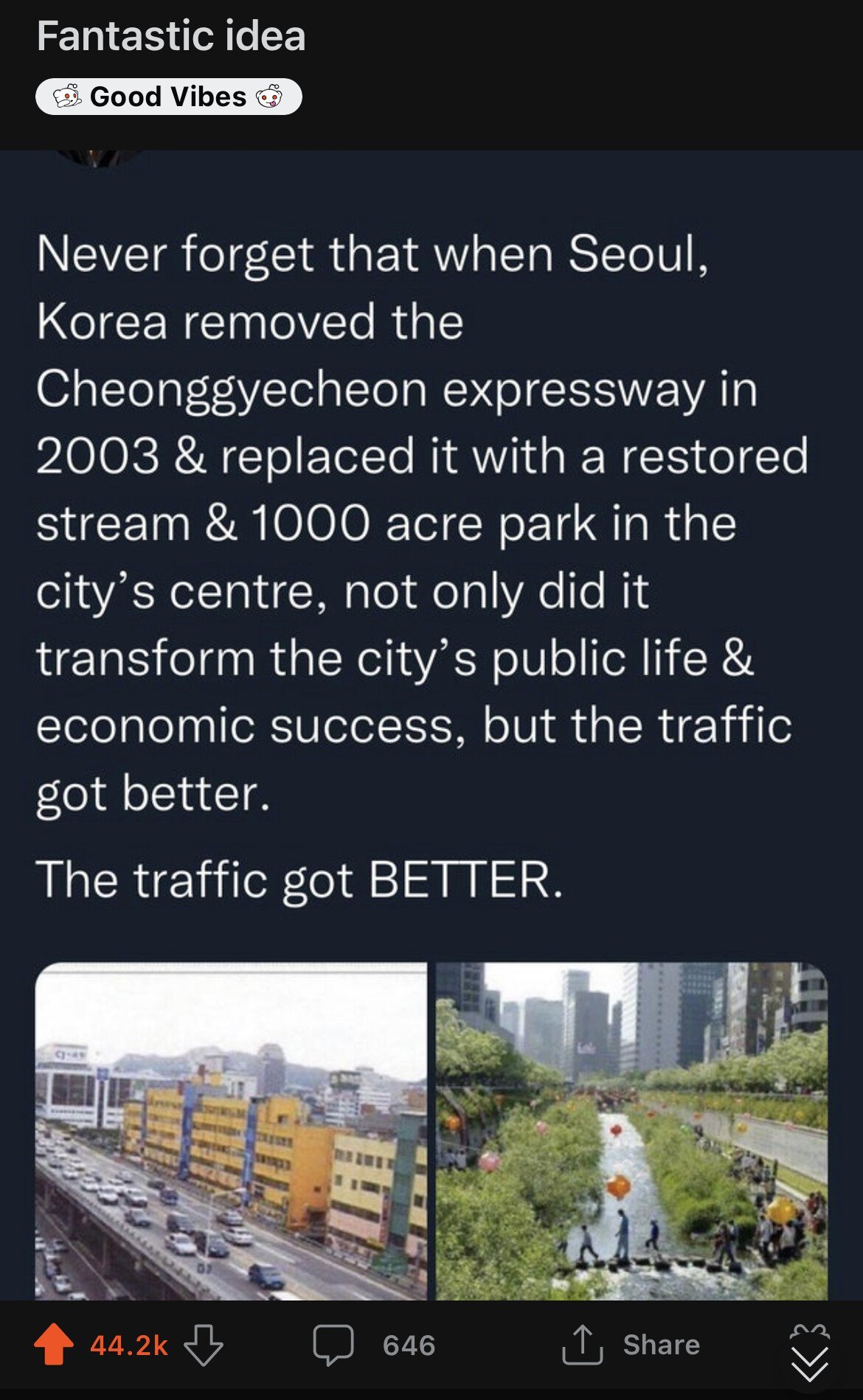서울특별시의 청계천 일대 복원사업. 이명박 당시 서울특별시장 의 진두지휘 하에 2003년 7월 1일 착공하여 2005년 10월 1일 완공하였다 나무위키