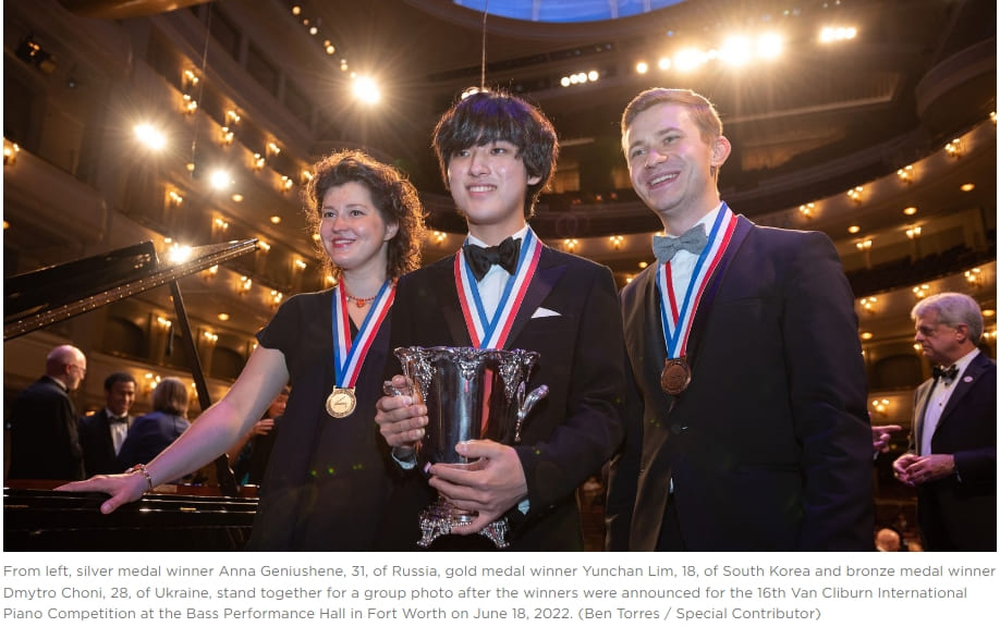 (왼쪽부터 은메달 수상자 안나 지니어스헤인(31)과 금메달 수상자 임윤찬(18)과 동메달 수상자 드미트로 초니(28) 우크라이나(28)가 2022년 6월 18일 포트워스 베이스 공연장에서 열린 제16회 반 클라이번 국제 피아노 콩쿠르 수상자 발표 후 단체사진을 위해 함께 서 있다.(벤 토레스 / 특별 기부자) dallasnews.com