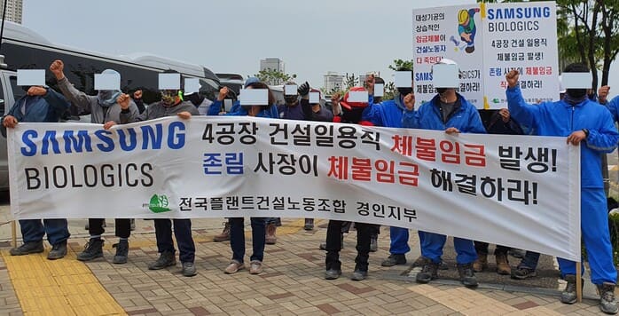 노조는 수시로 발생하는 임금체불에 대해서도 짚었다. “지난 5월에는 2022년에만 4번이나 임금이 지연된 것에 항의하는 대성기공 소속의 노동자들이 삼성바이오로직스 존림 사장의 집 앞까지 찾아가 항의하는 시위를 벌이기도 했다. 상습 체불을 일으켰던 대성기공이 사장은 최저가로 입찰한 상황에서 설계 변경, 자재값 인상 등으로 적자가 심각하다고 하면서, 임금을 지급하기 위해 수차례 대출을 받았지만 이젠 그마저도 할 수 없는 상황이라고 했다. 노동자들의 투쟁이 지속되자 결국 삼성바이오로직스는 중간 도급업체인 테크로스워터앤에너지의 도급비를 인상함으로써 임금이 지급되도록 했다”고 말했다.