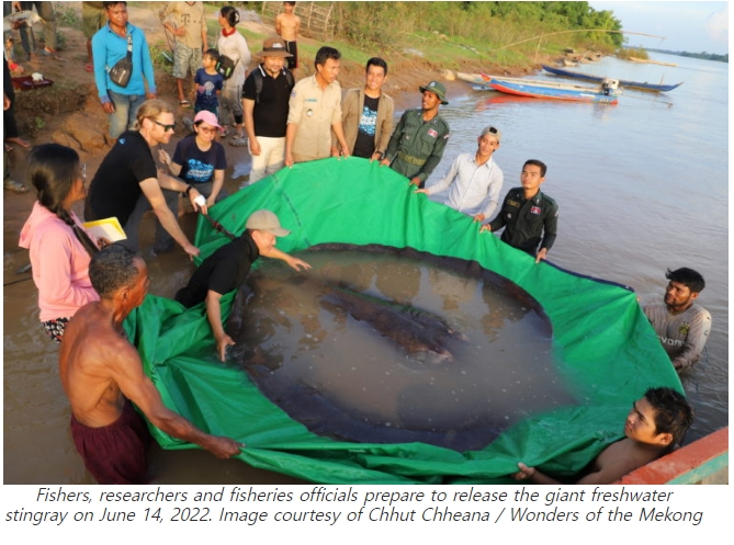 지금까지 기록된 가장 큰 민물고기는 지난 주 캄보디아 북부의 강 생물 다양성을 기록하기 위해 연구원들과 협력한 한 어부에 의해 메콩강에서 포획되었다. 4미터(13피트)의 멸종 위기에 처한 거대한 민물 가오리는 6월 13일 측정되기 전에 강에서 끌어올려져 야생으로 다시 방사되었다.