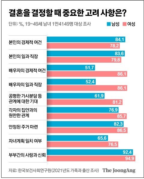 이에 반해 여성은 남성과 마찬가지로 ‘부부간의 사랑과 신뢰’(94.9%)를 가장 중요한 요소로 꼽았지만, 이후에는 ‘안정된 주거 마련’(86.5%), ‘배우자의 일과 직장’(86.1%), ‘배우자의 경제적 여건’(86.1%), ‘각자의 집안과의 원만한 관계’(85.7%), ‘공평한 가사 분담 등 평등한 관계에 대한 기대’(81.2%), ‘본인의 일과 직장’(79.8%), ‘본인의 경제적 여건’(78.2%), ‘자녀계획 일치 여부’(76.5%) 등의 순이었다.