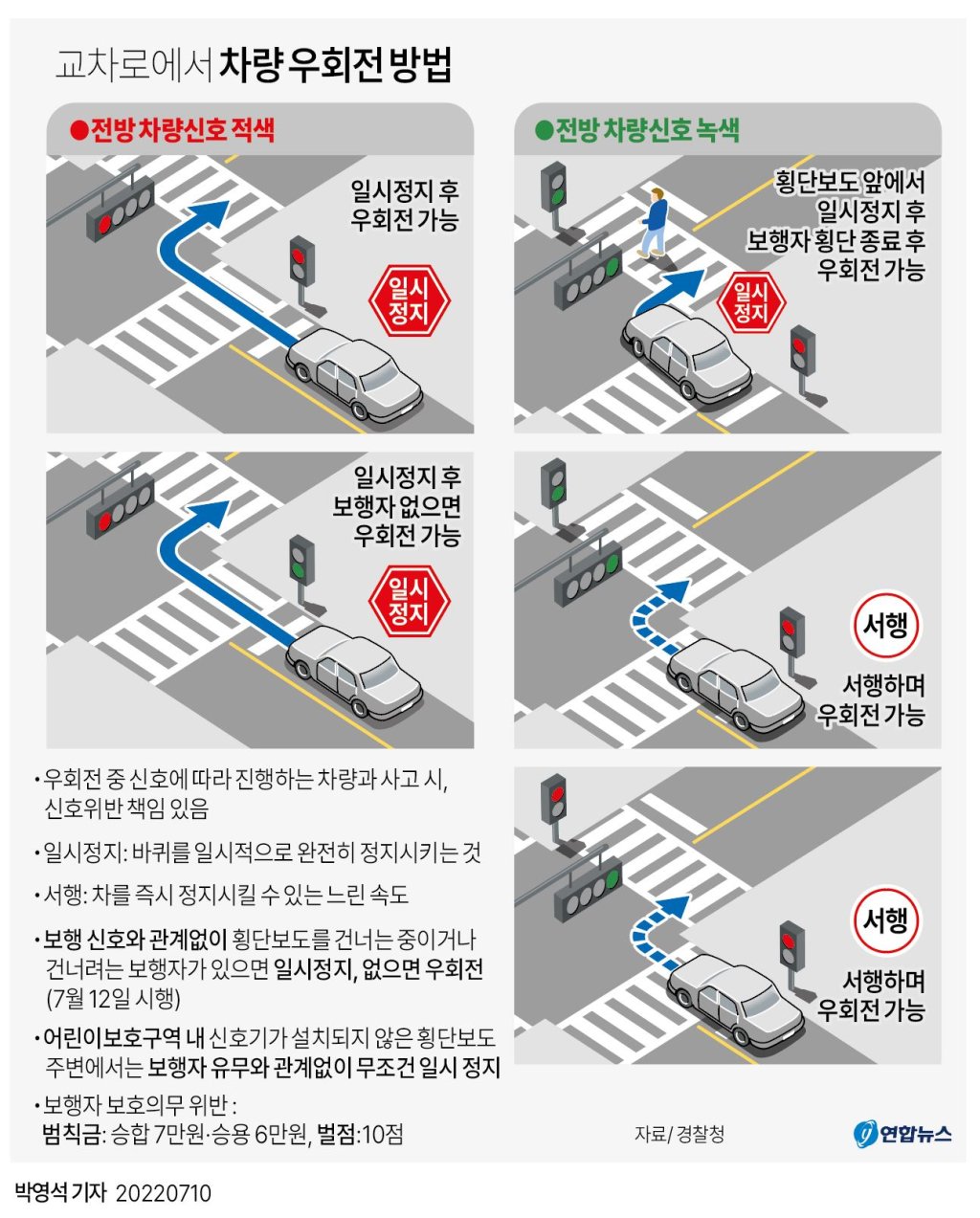 이달 12일 횡단보도 앞 일시 정지 의무를 확대하는 내용의 개정 도로교통법 시행을 앞두고 경찰은 혼란을 피하려면 우회전 시 보행자를 확인하는 게 우선이라고 10일 밝혔다.