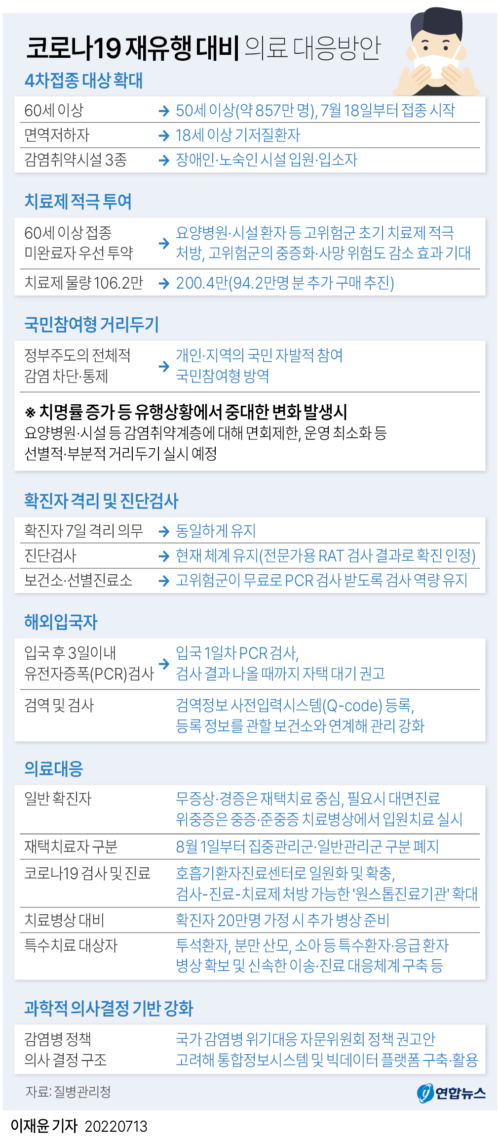 코로나19 유행세가 가파른 증가세를 보이는 가운데 13일 정부가 4차 접종을 50대로 확대하는 내용을 핵심으로 하는 대응책을 마련했다.