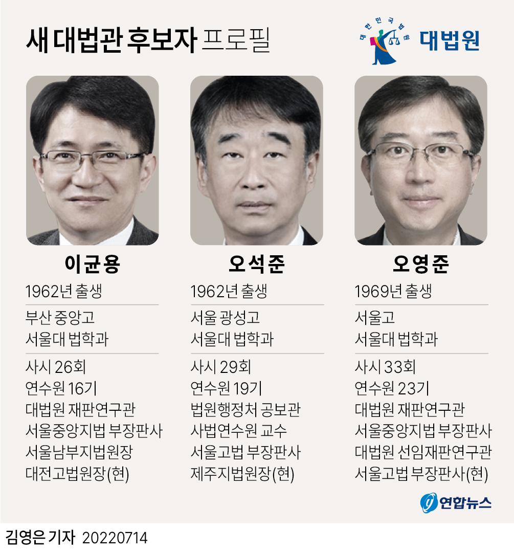 윤석열 정부가 임명하는 현 김재형 대법관 후임의 첫 대법관 후보가 이균용(60·사법연수원 16기) 대전고법원장과 오석준(60·19기) 제주지법원장, 오영준(53·23기) 서울고법 부장판사 등 3명으로 압축됐다.