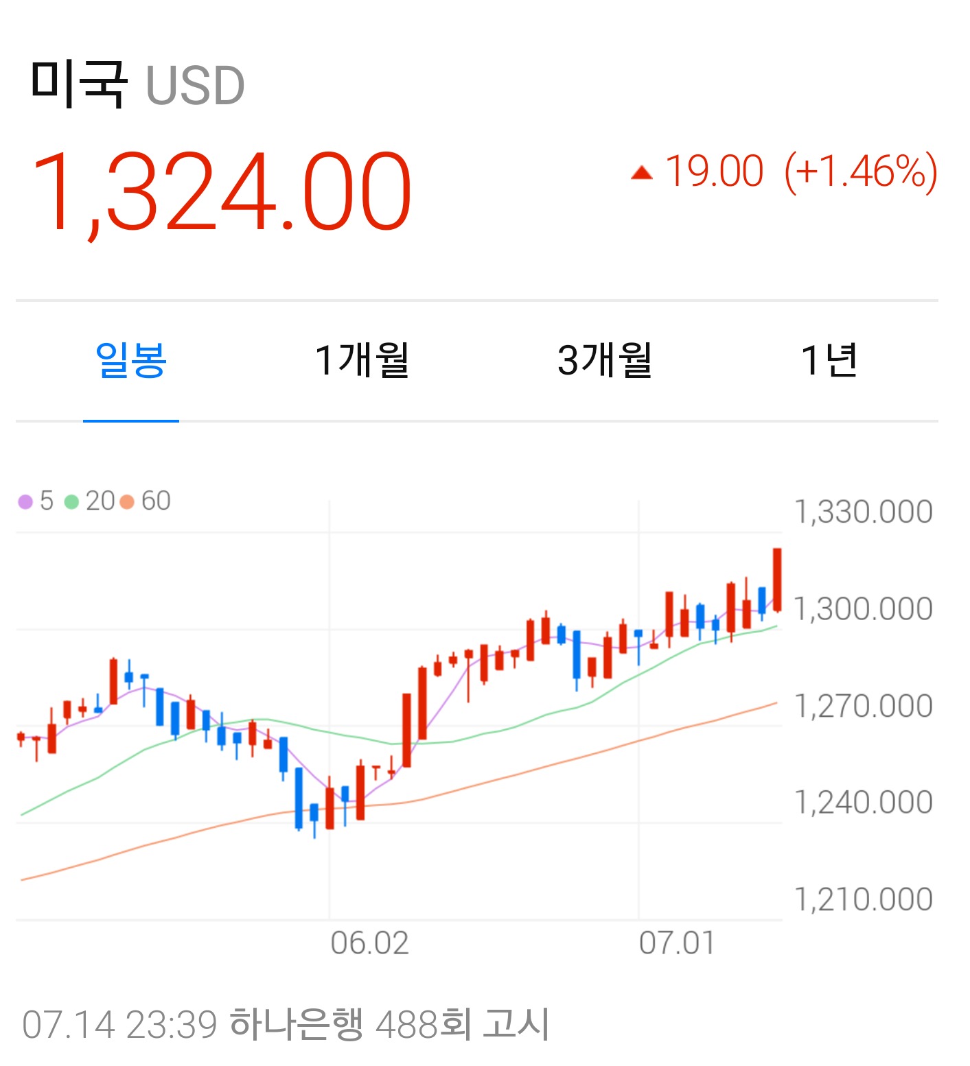 원달러 환율 연일 고공행진(1,324원) 불구...비트코인은 상승?