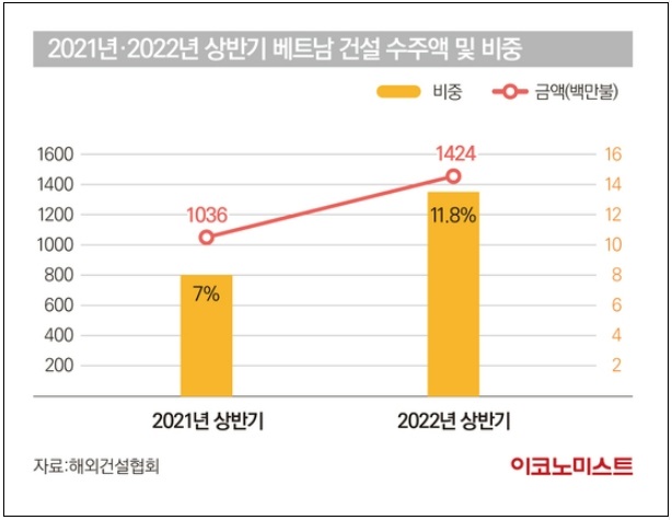 방역 조치로 셧다운 된 건설시장이 기지개를 켜며 국내 건설사 일거리도 늘고 있다. 최근 들어 국내 건설사들은 현지 주택 및 오피스빌딩 위주로 수주하고 있다. 해외건설협회에 따르면 올해 상반기 국내 건설사의 베트남 수주액은 14억2400만 달러로 지난해 같은 기간 10억3600만 달러보다 37.5% 증가했다. 전체 수주액에서 차지하는 비중 역시 7%에서 11.8%로 커져 인도네시아, 사우디에 이어 3위를 기록했다.