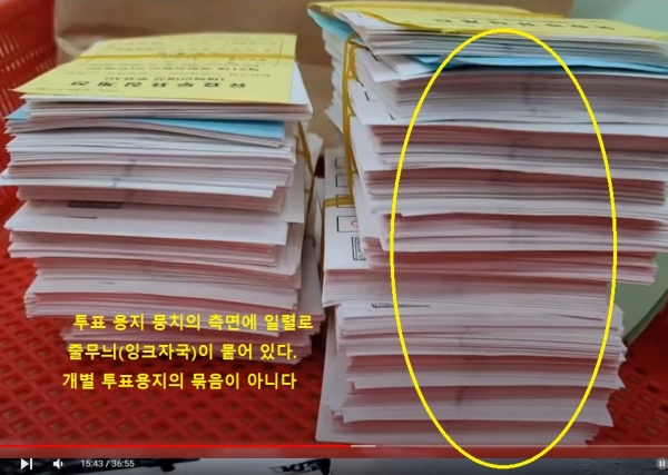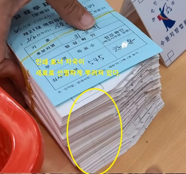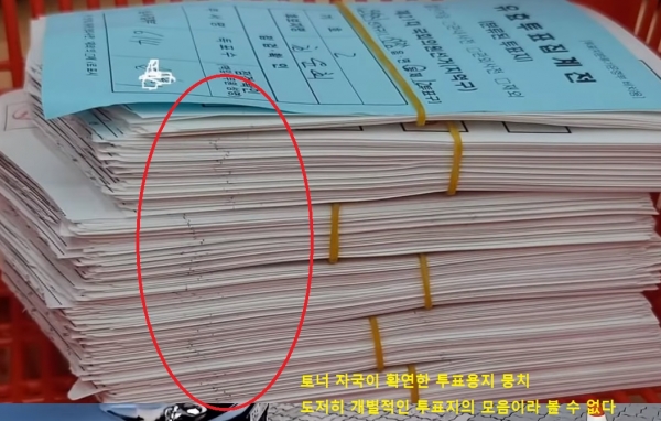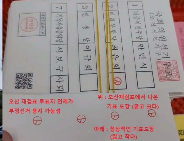다음은 오산시 선거무효소송 대리인단 박주현 변호사가 공개한 비정상 투표용지들이다. 이 모든 투표지들은 10월 29일 재검표 현장에서 발견되었다.