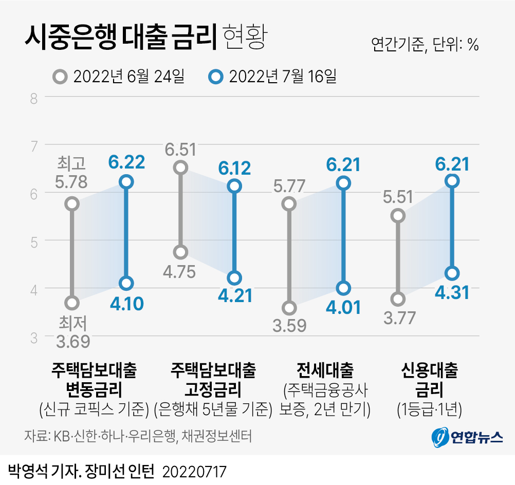 6월 24일(3.950∼5.771%)과 비교해 불과 20일 사이 하단이 0.420%포인트(p), 상단이 0.437%포인트 올랐고 작년 말(3.390∼4.799%)보다는 상·하단이 각 0.620%포인트, 1.481%포인트나 뛰었다.