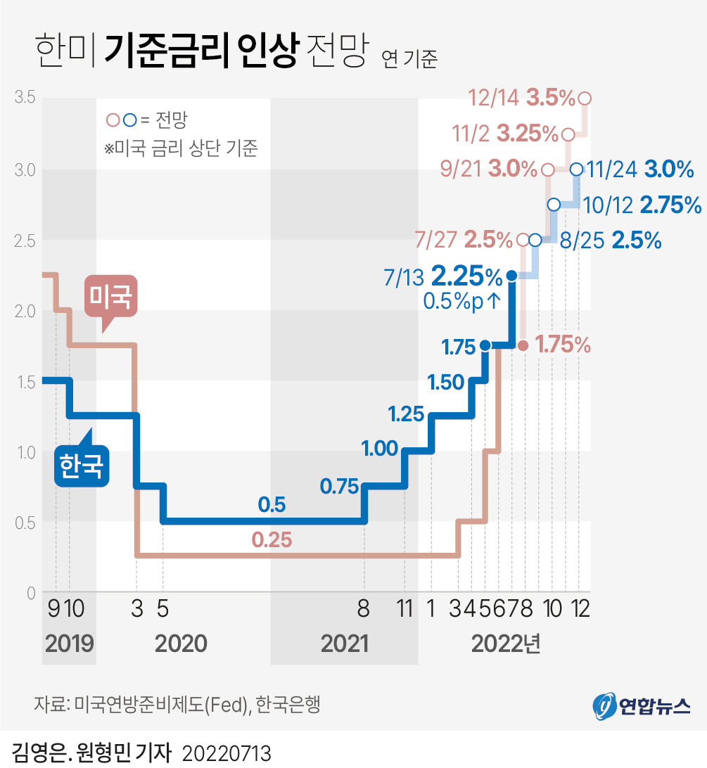 미국 연방준비제도(Fed·연준)가 이달 통화정책회의에서 기준금리를 0.75%포인트 인상할 것이 확실시됨에 따라 한국과 미국의 기준금리 역전이 불가피할 전망이다.
