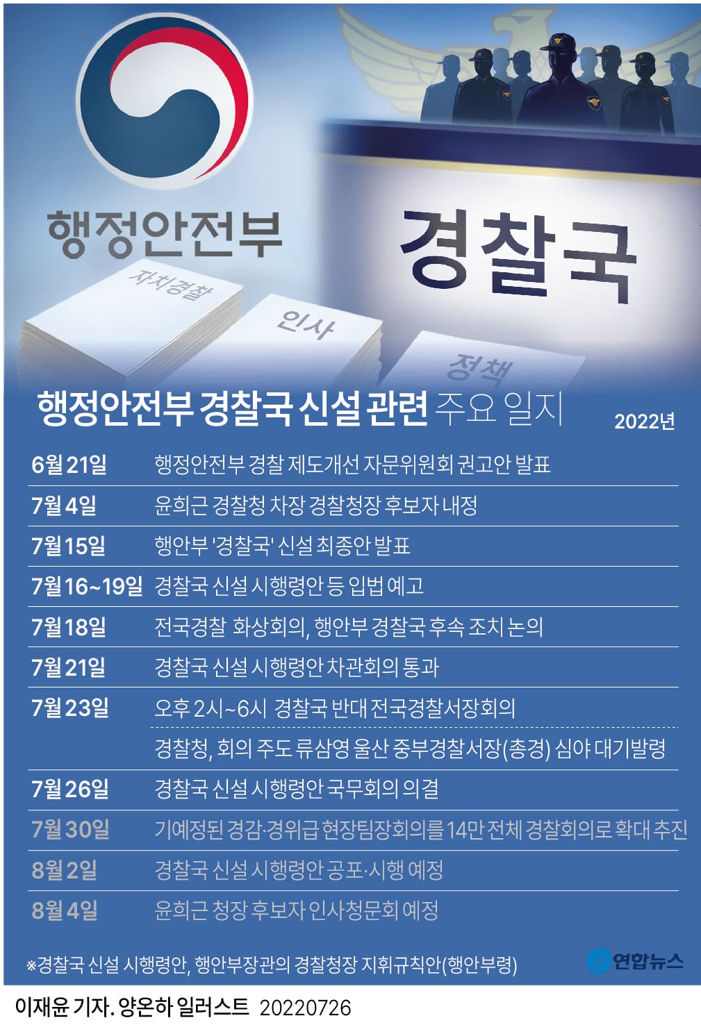 정부는 이날 정부서울청사에서 한덕수 국무총리 주재로 열린 제33회 국무회의에서 행안부 경찰국 신설 시행령안을 의결했다고 총리실이 밝혔다.