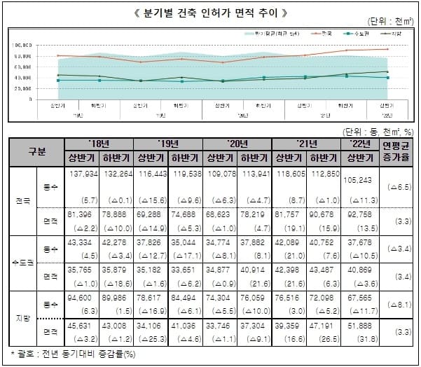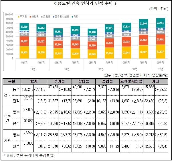 2022년 상반기 건축 인허가 면적은 전년 동기 대비 13.5% 증가한 92,758천㎡, 동수는 △11.3% 감소한 105,243동이다.