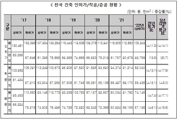 국토부, 2022년 상반기 전국 건축 인허가 현황 발표...착공 준공 모두 감소
