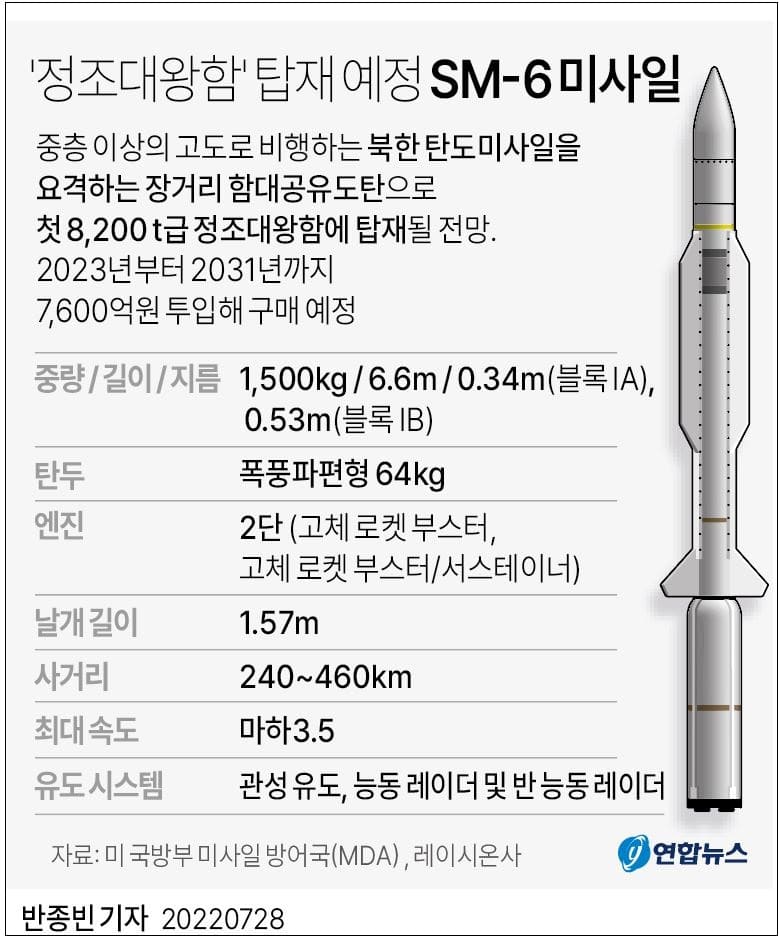 정조대왕함에는 한국형 수직발사체계-Ⅱ를 설치해 해상에서 북한의 탄도미사일을 요격할 수 있는 SM-6 미사일 등 장거리 함대공유도탄을 처음 탑재할 예정이다.