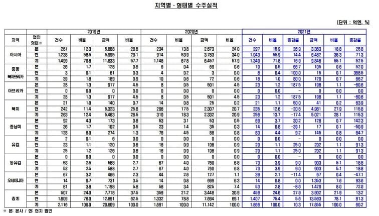 형태별로는 본사수주 비중이 21.9%, 현지법인이 78.1% 였다.