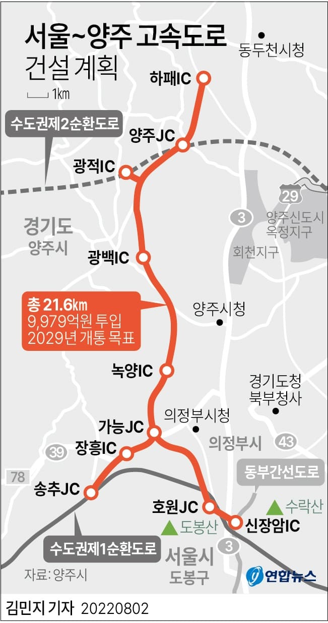 2일 양주시에 따르면 서울 경계부터 경기 의정부를 거쳐 양주까지 21.6㎞를 왕복 4차로로 잇는 '서울∼양주 민자고속도로'의 건설사업이 현재 국토교통부의 민간 투자사업 심의를 앞두고 있다.