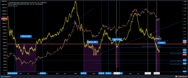 SOPR 중 155일 이상의 UTXO만을 포함한 값을 장기 SOPR이라고 부르고 장기 보유자를 의미합니다.