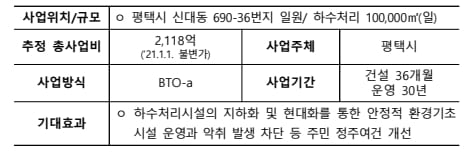 평택 통복 하수처리장 현대화사업은 약 2100억원을 들여 통복 하수처리장을 평택 신대동으로 이전·증설하고 지하화하는 프로젝트다. BTO-a 방식이며 한화건설이 최초 제안자 자격을 지니고 있다. 제3자 공고를 거쳐 내년 착공에 돌입한다는 계획이다. 준공 목표 시점은 2026년 말이다.