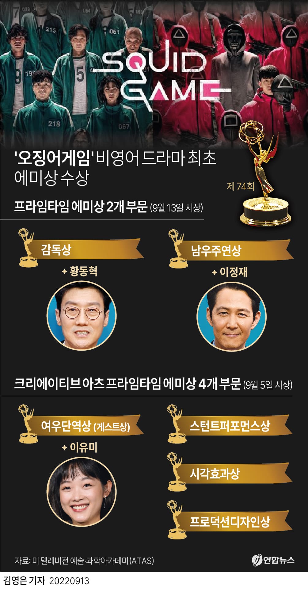 미국 현지시간 12일(한국시간 13일) 넷플릭스 시리즈 '오징어 게임'이 미국 방송계 최고 권위상 에미상 시상식에서 6관왕을 달성하며 새 역사를 썼다.