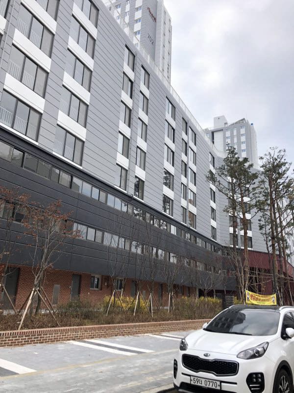 LH가 충남 아산시 배방읍 세교리 일대에 건축 중인 ‘아산탕정 2-A15블록’ 국민임대주택. 단지 외벽에 대각선 형태 계단이 달려 있어 지나가는 사람들의 눈길을 끈다. 계단이 같은 동 2~3개층을 연결하는 구조다.