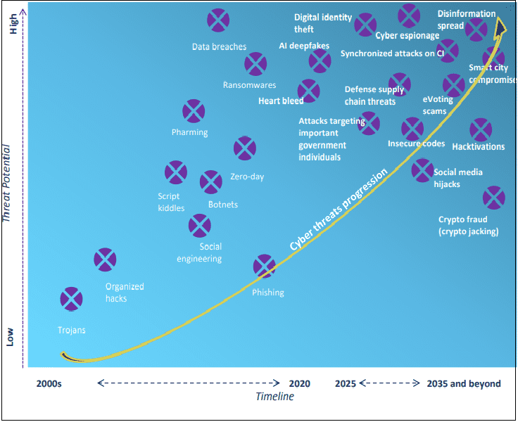 2000년대 초반에 Trojan horse라는 악성 프로그램이 세상에 공개되면서 사이버 전쟁의 시작을 알렸었다. 트로이 목마로도 불리며, 악성 루틴이 숨어있는 프로그램으로 겉보기에는 정상적인 프로그램이지만 실행하면 악성코드가 실행되는 공격 패턴을 보인다. 그 후에 2020년대에는 Ransomware, AI 딥 페이크, heartbleed와 같은 악성 프로그램, 디지털 해킹 등으로 종류가 늘었으며, 2030년대 중반에는 무려 10가지 이상의 사이버 테러로 종류가 늘어날 것으로 전망하고 있다. 나날이 다양해지고 정교해진 사이버 위협에 맞서 국가 기밀 보안의 프로젝트를 보호하기 위해 국가 정보의 보호 필요성에 대한 목소리가 미국 정부에서 커지고 있다.