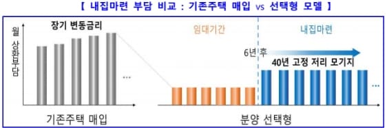 ② 선택형은 입주 시점에는 보증금의 80%까지 최저 1.7% 고정금리로 전용 전세대출을, 6년 후 분양 선택시점에는 최대 5억원 한도, 40년 만기의 고정 저리 모기지(나눔형 동일)를 지원할 계획이다.