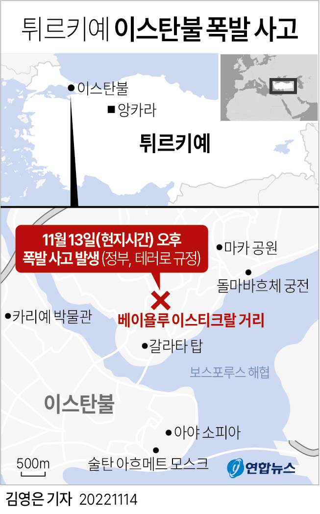 레제프 타이이프 에르도안 터키 대통령은 이스탄불의 혼잡한 이스티클랄 도로를 덮친 폭발로 최소 6명이 숨지고 수십 명이 다쳤다고 말했다.