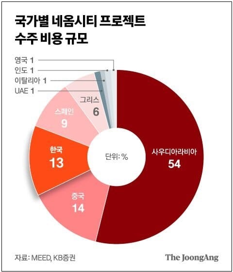 금융투자업계에선 네옴시티 초기 프로젝트 사업비 규모를 약 500억 달러(71조원) 수준으로 추산하고 있다. KB증권에 따르면 이 중 한국 기업의 수주 규모는 13%로, 사우디(54%)·중국(14%)에 이어 세 번째다.