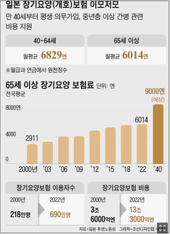 또 젊은층 부담을 낮추기 위해 일본 정부는 소득이 많은 고령자의 장기요양(개호) 보험료 인상도 추진 중이다. 노인 인구가 급격히 증가하면서 고령자 간병에 들어가는 장기요양(개호)보험 비용은 올해 13조3000억엔(약 128조원)을 기록하며 역대 최대치를 경신했다. 일본에서 장기요양보험은 40세부터 의무적으로 가입해야 한다. 현재 65세 이상 노인이 한달에 납부하는 개호보험료는 평균 6014엔(약 5만8000원)인데, 일본 정부는 이를 9000엔까지 올리겠다는 계획이다.