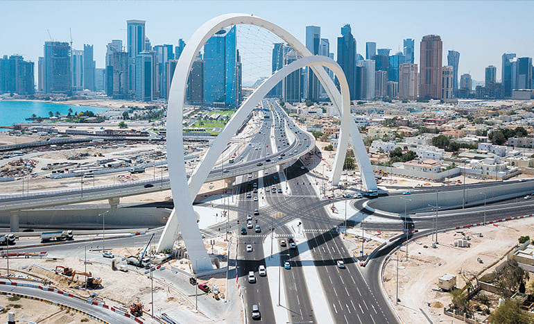 카타르 국민들의 발이 되어주는 루사일 고속도로는 왕복 16차로로 현대건설은 도로와 터널, 상하수도, 통신 라인, 변전소 등 각종 제반 시설을 건설했는데요. 루사일 고속도로의 남쪽 시작점 ‘와다(Wahda) IC’에 가면 높이 100m의 대형 아치 구조물도 볼 수 있습니다. 두 개의 아치가 서로 교차하는 이 구조물은 오가는 사람들의 시선을 사로잡습니다.