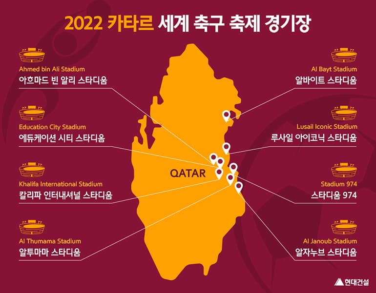 축구 축제를 위해 카타르를 방문하는 관광객들의 이목이 집중되는 곳은 바로 경기가 열리는 스타디움이겠죠. 8개의 경기장은 카타르 도하 중심부로부터 각각 북쪽과 남쪽, 서쪽에 흩어져 있는데, 각 경기장 마다 카타르의 역사와 문화가 깃들어 있습니다.