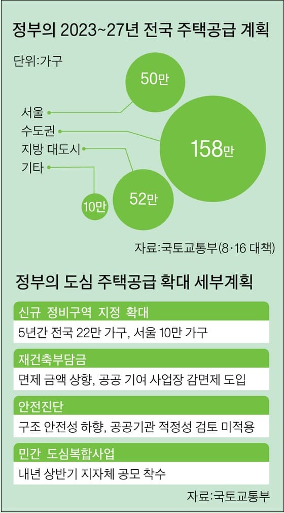 다른 하나는 도심 즉, 주택 수요가 있는 지역에서의 주택 공급이다. 서울에는 집을 새로 지을 땅이 거의 남아 있지 않다. 서울에서 주택을 공급하려면 재개발·재건축과 같은 정비사업 외에는 방법이 없는 셈이다. 이는 윤석열 정부의 정책 기조와도 맞닿아 있다. 정부는 다음 주 중 재건축 사업의 첫 단계인 안전진단 절차 완화 방안을 발표할 예정이다. 안전진단 평가 항목 중 ‘구조 안전성’의 가중치를 현행 50%에서 30%로 대폭 낮추고, 2차 정밀 안전진단(적정성 검토)도 지자체에 권한을 위임해 제한적으로 시행하기로 했다. 현실화하면 서울 양천구 목동 신시가지와 노원구 상계주공 등 재건축 초기 단계 단지들의 사업이 급물살을 탈 수 있을 전망이다.