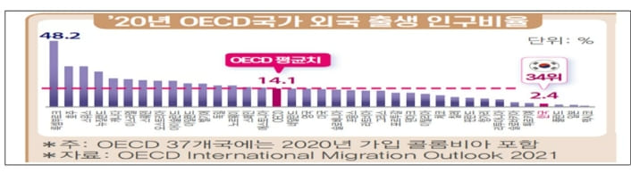 * 2020년 외국 출생 인구비율 : OECD 평균 14.1%, 한국 2.4% (OECD 37개국 중 34위)