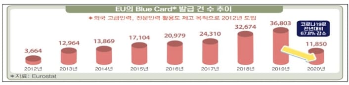 (EU) EU의 경우에는 2016년 외국 고급인력 및 전문인력 활용 목적으로 블루카드(EU Blue Card) 발급기준을 기존 EU회원국 평균임금의 1.5배 이상이었던 고용계약서 상 최저 연봉기준을 낮추고, 1년 이상이었던 고용계약기간 기준을 6개월로 단축하는 등 완화하였다.