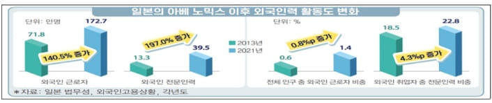 (일본) 2013년부터 일본재흥전략(일명 아베노믹스) 하에 고급인재 인정요건 완화(2013년 12월), 고급인재 재류기간 무제한 자격 신설(2015년 4월), 일본 거주 외국인 연구·경영자에 대한 영주권 취득요건 완화 [고도외국인재 그린카드제도 도입(2017년 1월, 종전 5년 → 1년)] 등 외국 전문인력 유치정책을 지속 강화하고 있다. 그 결과, 일본의 외국인 취업자 중 전문인력 비중은 2012년 18.5%에서 2021년 22.8%로 4.3%p 증가하였다.