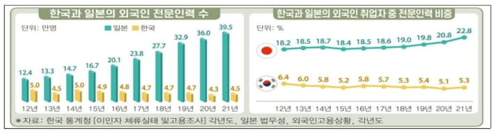 외국 전문인력 활용도는 경쟁국 일본의 1/5 수준에 불과하다. 2021년 일본의 외국인 취업자 중 전문인력 비중이 22.8%인 반면 한국은 5.3%에 그쳤다. 한일간 외국 전문인력 활용도 격차가 큰 것은 한국이 1991년 산업연수생제도(현 고용허가제) 실시 이후 30년 이상 단순 기능인력 중심 외국인력정책을 지속한 반면, 일본은 2013년부터 일본재흥전략(* 일명 아베노믹스) 하에 외국 인재 유치정책을 강화한 결과이다.