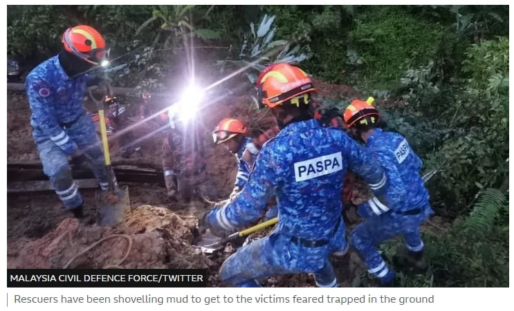 산사태로 최소 21명이 사망한 가운데 말레이시아 수색구조대가 셀랑고르주에 있는 휴가 캠프장을 수색하고 있다.
