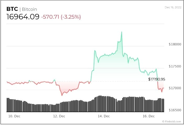 비트코인은 뉴욕 시간 16일 오후 2시 41분 코인마켓캡에서 24시간 전 대비 3.54% 내린 1만6838달러를 가리켰다.
