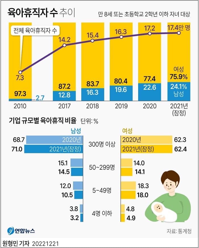 21일 통계청이 발표한 '2021년 육아휴직 통계'에 따르면 지난해 만 8세 또는 초등학교 2학년 이하의 자녀를 대상으로 육아휴직을 시작한 사람은 전년보다 1.0% 증가한 17만3천631명이었다.