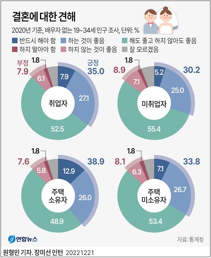 통계청이 '배우자 없는' 19∼34세 인구를 '2020년 사회조사'와 연계해 분석한 결과 취업한 청년의 35.0%가 결혼에 대해 긍정적인 것으로 나타났다.
