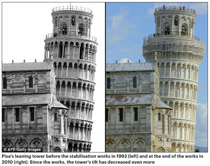 (Source: dailymail.co.uk/sciencetech/article-11565699/The-Leaning-Tower-Pisa-crept-upright-1-6-INCHES-20-years-study-finds.html)