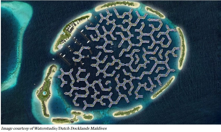 기후 변화로 인한 해수면 상승은 몰디브의 많은 부분이 2050년까지 사람이 살 수 없다는 것을 의미한다. 이에 대응하여, 한국 정부는 건축 관행인 워터스튜디오와 제휴하여 빠르면 2024년 수도 근처의 석호에 2만 명의 사람들을 수용할 부유 도시를 설계했다.