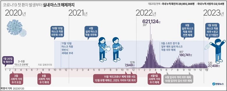 2020년 1월 국내에서 코로나19 첫 확진자가 발생한 지 3년여 만이고, 같은해 10월 실내 마스크 착용 의무가 정부 차원에서 전국에 도입된 지 약 27개월 만의 일이다