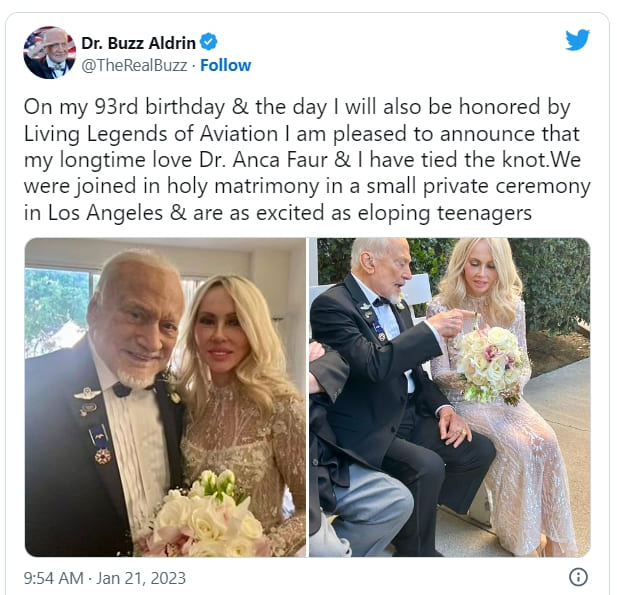 1969년 7월, 버즈 올드린은 아폴로 11호 임무의 일환으로 달을 걸어본 최초의 두 사람 중 한 명이 되었다. 2년 후 나사에서 은퇴한 후, 그는 우주 탐험의 옹호자가 되었다. 이제, 그는 또 다른 이정표에 도달했다. 그는 결혼을 했다. 이 전설적인 우주비행사는 93세가 되었다; 그리고 그 축하 행사의 일환으로, 그는 로스앤젤레스에서 그의 오랜 파트너인 앤카 파우 박사와 작은 결혼식을 올렸다.