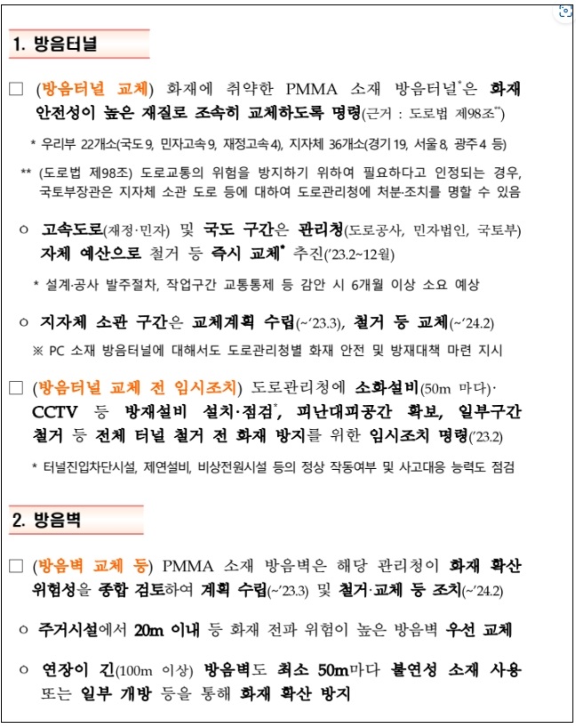 국토부 소관 고속도로와 국도 구간의 방음터널부터 소재 교체에 돌입하고 올해 말까지 공사를 완료할 계획이다. 지자체 소관 방음터널도 교체계획을 수립하도록 해 내년 2월까지 교체할 예정이다.